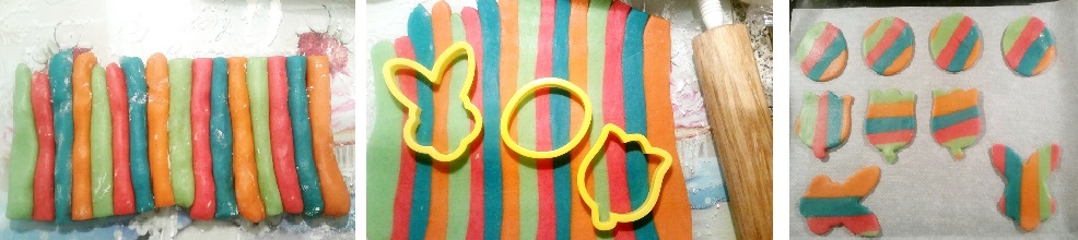 Préchauffez le four à 150°C. Séparez chaque pâton en 4 et formez des boudins de pâte que vous posez les uns à coté des autres en alternant les couleur. Abaissez doucement la pâte pour former un bloc de pâte multicolore et découpez-là avec les emporte-pièces. (J’ai plus ou moins réussi par la suite à séparer de nouveau au couteau chaque couleur pour refaire des sablés. Au final quelques couleurs se mélangent mais cela ne me dérange pas!)
