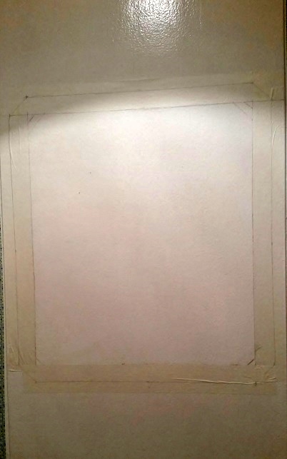 - Nettoyez la surface à peindre avec un produit adapté (type St Marc). Dessinez le cadre à la dimension voulue et dans la forme choisie. Pour une question de facilité, j’ai choisi un rectangle. Collez du ruban de masquage sur les contours afin de peindre précisément sans dépasser. La peinture de ma porte est brillante donc j’ai poncé légèrement la surface.