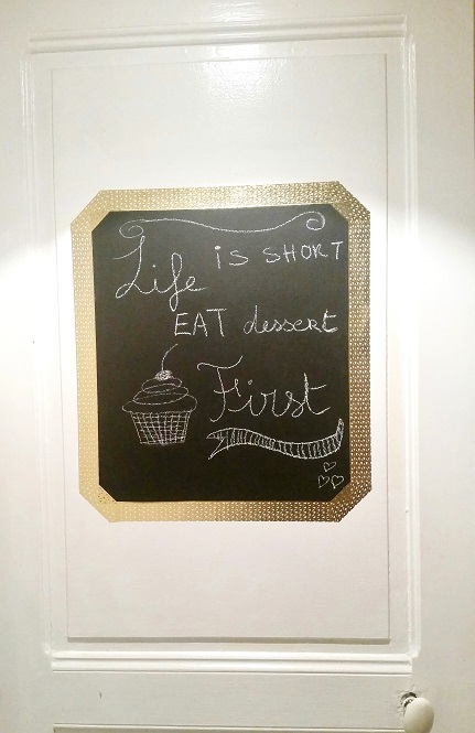 Il y a des centaines de façons d’utiliser la peinture ardoise : sur tout un mur, une porte, des meubles, des mugs etc… J’ai toujours trouvé les tableaux très pratiques pour noter les choses à faire,à acheter, à ne pas oublier, pour laisser des mots doux ou avoir des messages laissés par mes amis après une soirée à la maison.