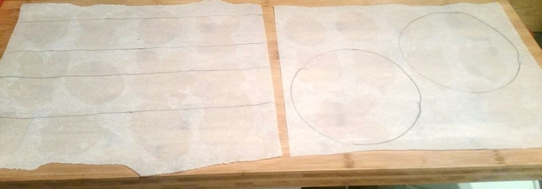 Pour faciliter le dressage des bandes de biscuit à la cuillère aidez vous d’un gabarit maison. Dessiner sur une feuille de papier cuisson des bandes de 5cm de largeur et pocher en suivant les lignes. Idem pour le disque. Penser à retourner le papier cuisson pour que les traits n’apparaissent pas sur le biscuit.