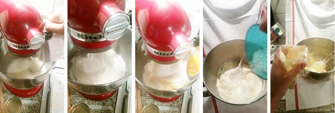 Quand les blancs sont au bec d’oiseau diminuer la vitesse ajouter les jaunes et continuer à battre 15 secondes, le temps qu’ils soient bien incorporés.