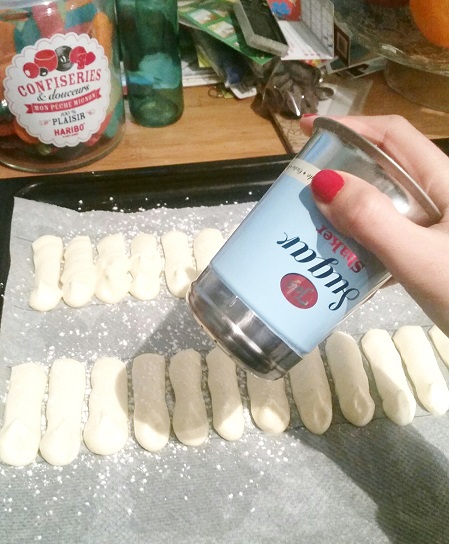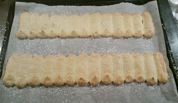 Je réalise les biscuits mais il est possible pour gagner du temps d’utiliser des biscuits cuillers industriels, il vous en faudra environ 20 pour faire le contour et le socle, mais tout dépend de la taille de votre cercle. Le montage sera légèrement plus compliqué avec les biscuits industriels car l’avantage de les faire soi-même est de réaliser les bandes pour les contours qui permettent un montage plus facile et plus net.