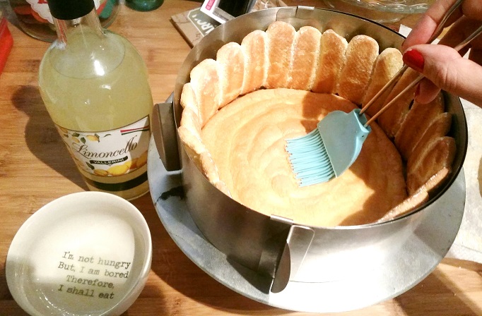 Imbiber légèrement le disque de limoncello (ou à défaut de jus de citron) et ajouter la moitié de la mousse au citron, puis déposer le 2e disque, l’imbiber de limoncello puis ajouter la reste de la mousse.