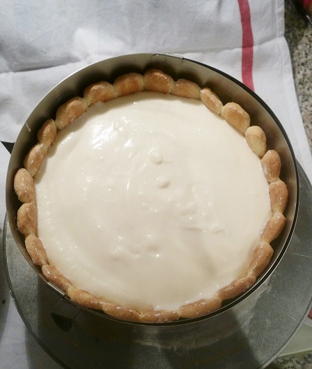 Utiliser le moule à rebord amovible. Poser les bandes biscuit sur le rebord du moule et le disque de biscuit dans le fond du moule. Je fais toujours les bandes de biscuits assez grandes quitte à supprimer quelques biscuits par la suite afin d’ajuster parfaitement la taille.