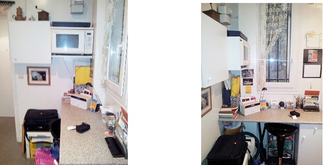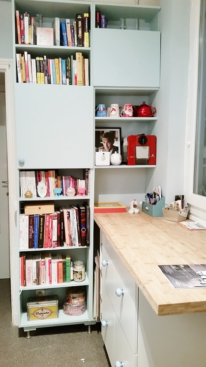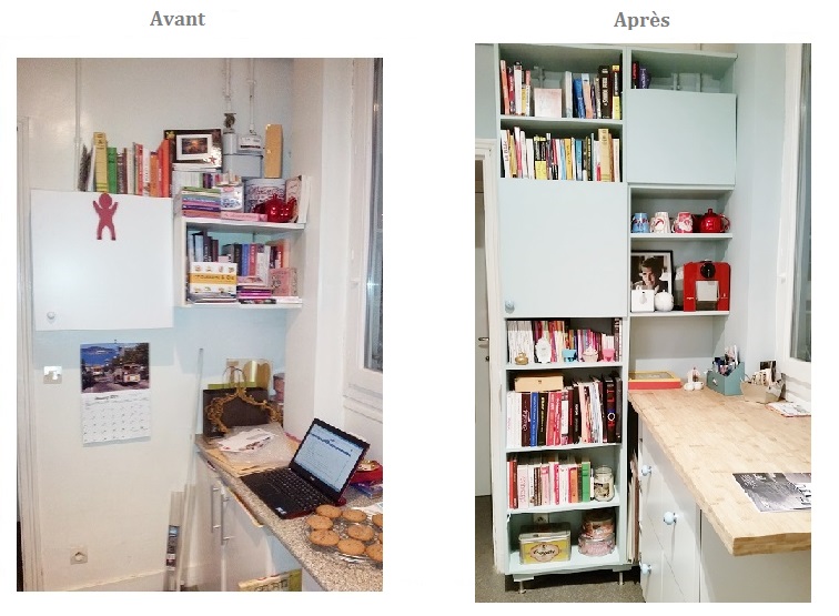 En même temps j’ai décidé de remplacer le bureau par un grand plan de travail haut pour avoir plus de rangements, plus de place lorsque je cuisine et un coin bar haut pour prendre rapidement mon petit déjeuner le matin!
