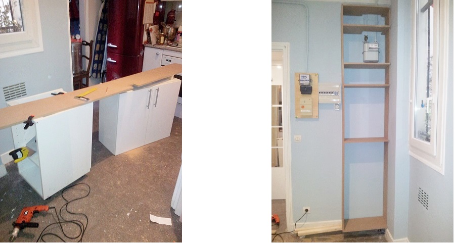 Après avoir ajusté et découpé le plan de travail (avec l’épaisseur du plan de travail la scie sauteuse est nécessaire à défaut d’une scie circulaire) pour qu’il s’encastre contre les murs et dans la bibliothèque, j’ai mis en place les bibliothèques qui n’ont pas besoin de fixation puisqu’elles sont encastrées et se fixent parfaitement entre le coffrage des tuyaux et le compteur électrique.