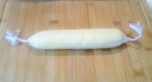 Mettre cette boule sur un plan de travail fariné et formez un boudin que vous déposez sur du film étirable. Enroulez la pâte avec le film et roulez à nouveau pour obtenir un tube uniforme.