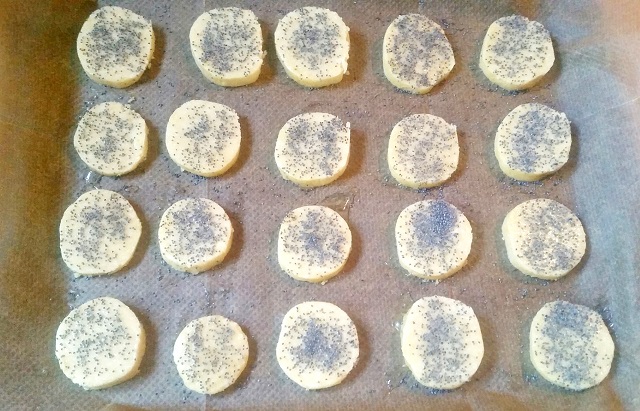 Déposez les sablés sur une plaque, à l’aide d’un pinceau badigeonnez les de blanc d’œuf et parsemez les graines de pavot.