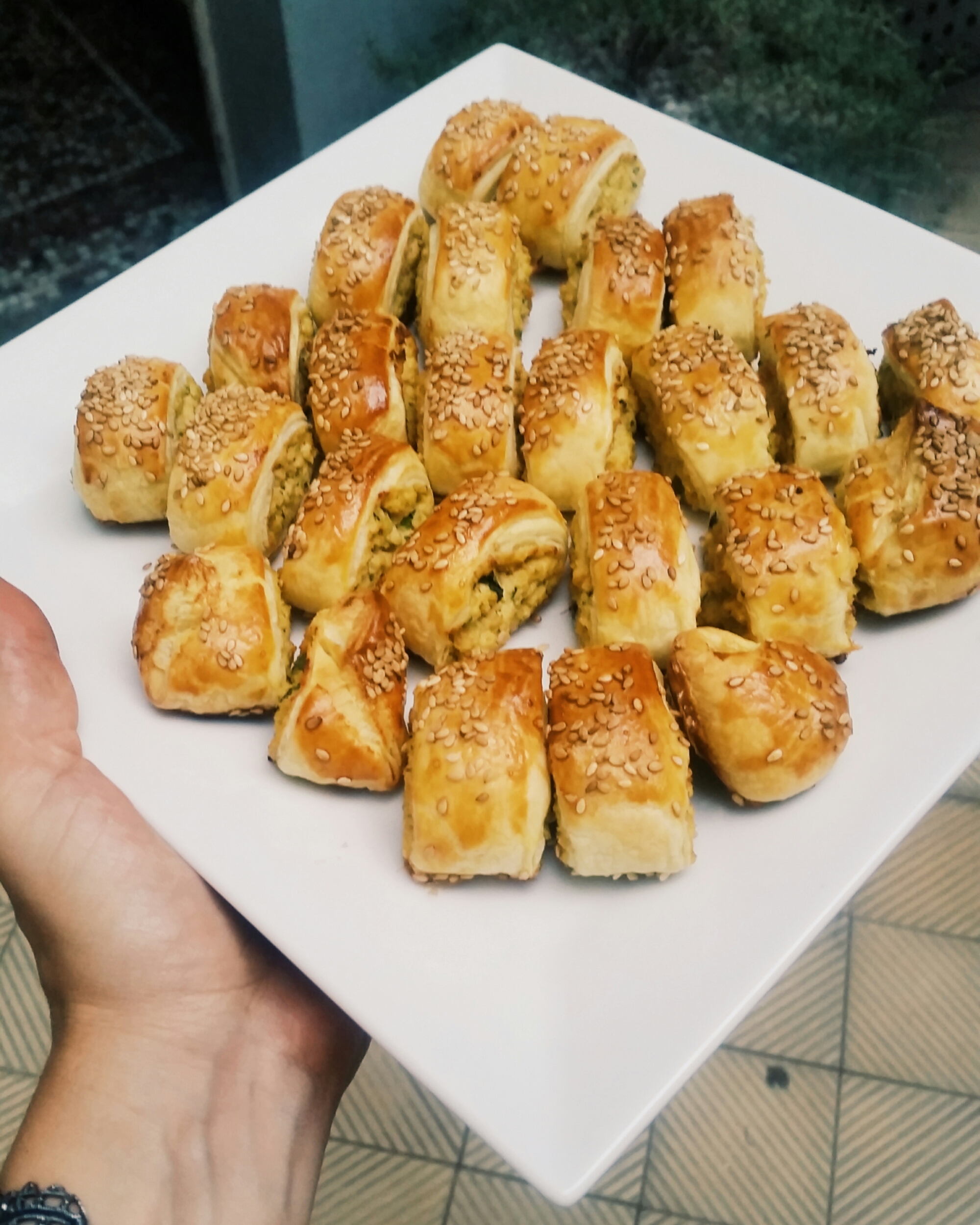 Découpez les roulés obtenus en biais en bouchées, appliquez au pinceau l’oeuf battu et parsemez de sésame.