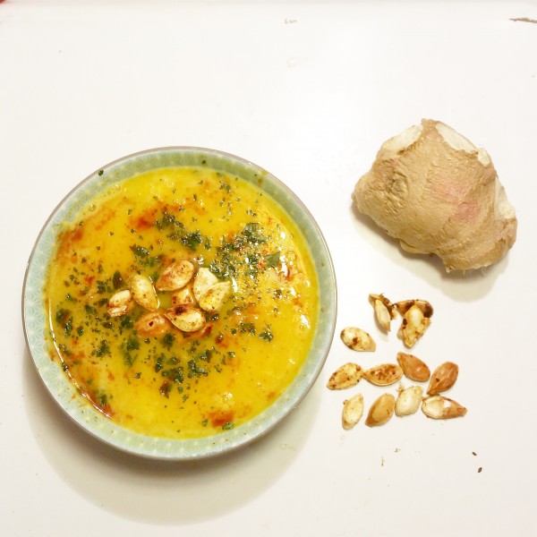 Ajoutez le gingembre rapé et faites cuire pendant 20 minutes environ. Mixez, ajoutez le lait de coco et mixez à nouveau.