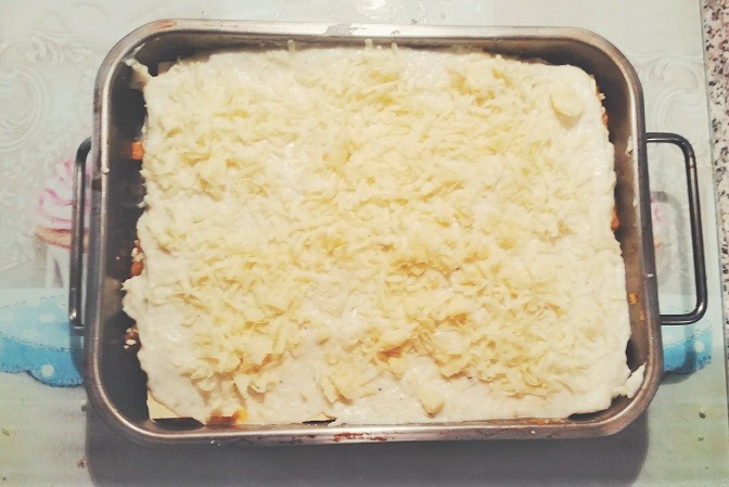 Recouvrez de feuilles de lasagnes, puis de courge et d’une cuillère à soupe de chapelure et de béchamel et parmesan râpé. Recouvrez d’une couche de feuilles de lasagnes de béchamel et rapez du parmesan dessus.