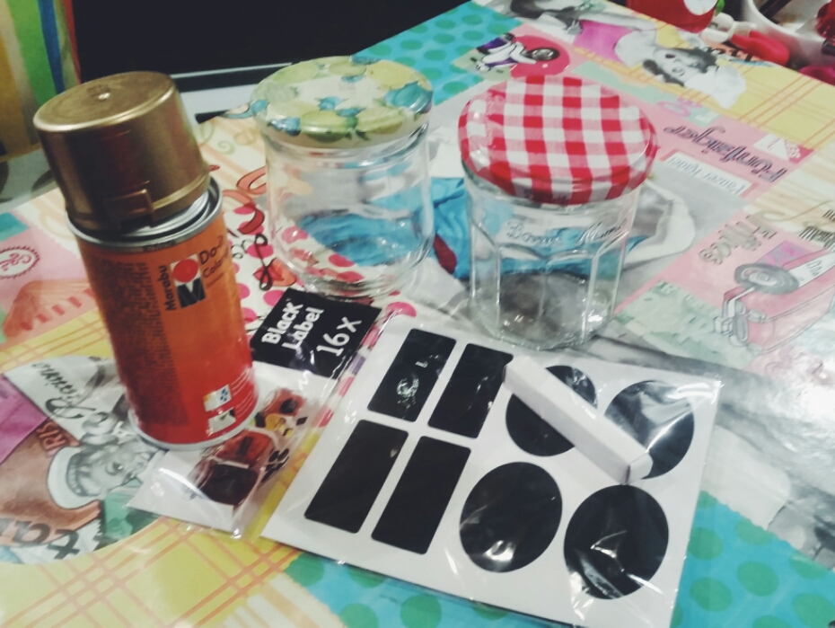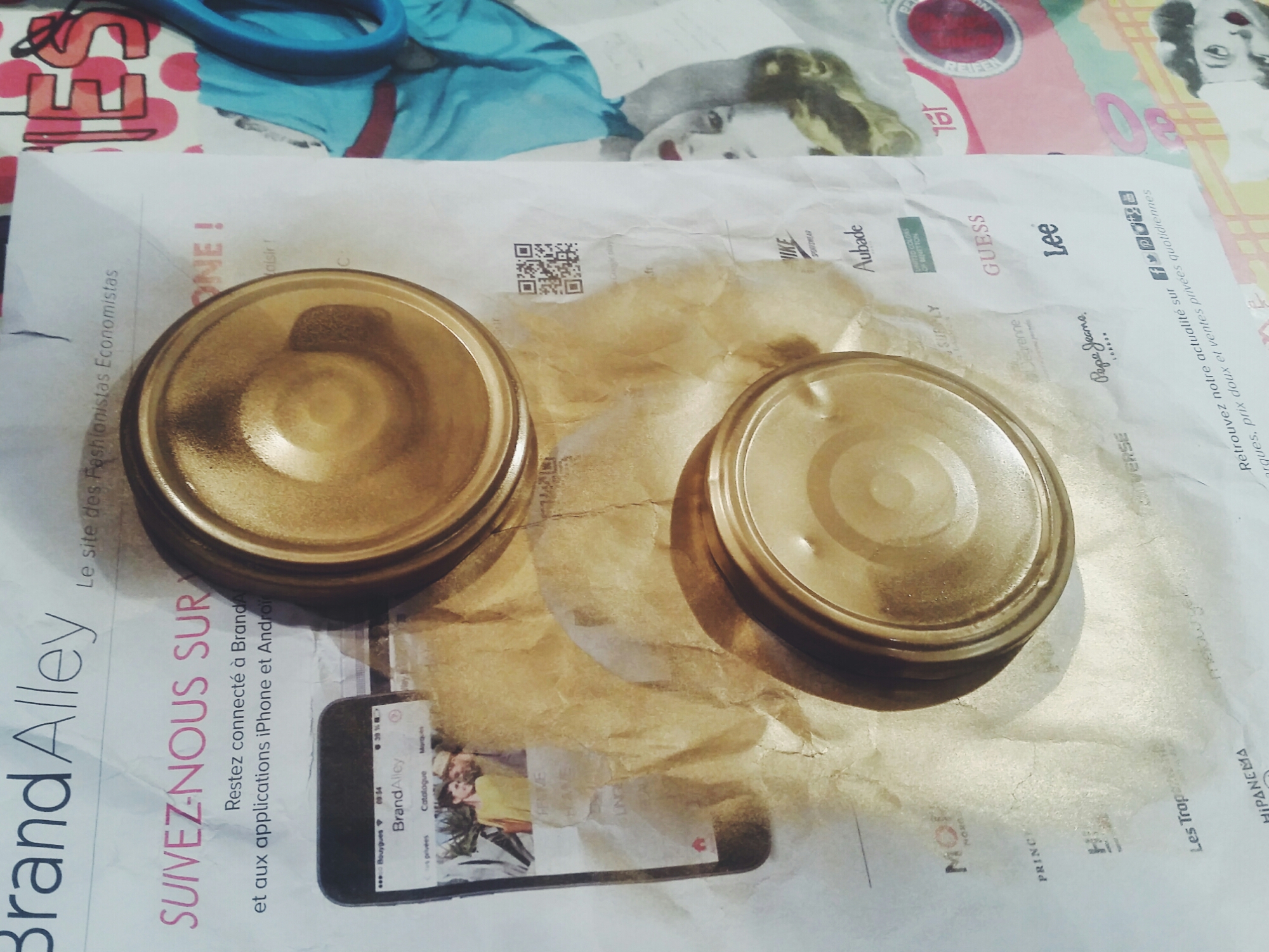 Le problème est que je me retrouve avec plein de pots ayant des couvercles différents et parfois moches… j’ai donc décidé d’uniformiser avec de la peinture et rajouter de quoi écrire le contenu.