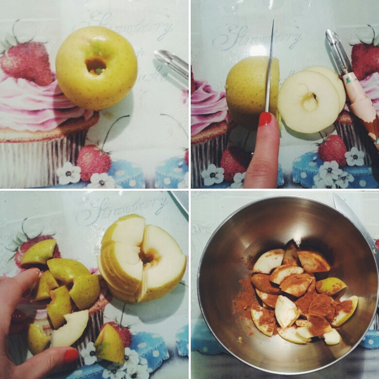 Si vous n’aimez pas la cannelle, passer à l’étape suivante sinon: les saupoudrer de cannelle (à titre indicatif j’ai utilisé 2cc de cannelle mais à vous de juger la quantité suivant vos goûts)et bien mélanger le tout pour recouvrir uniformément les pommes.
