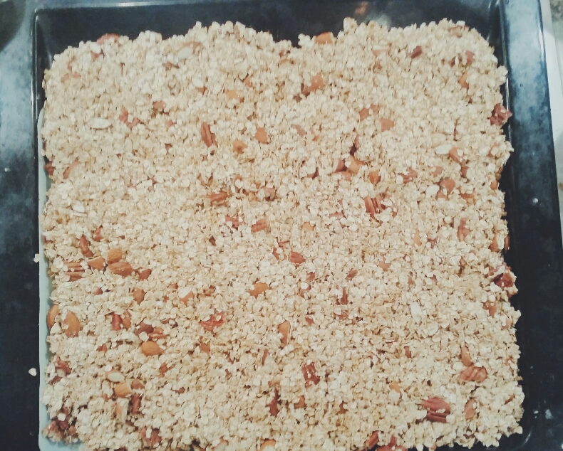 Émincer très grossièrement les amandes et noix de pécan et les mélanger dans un saladier avec les flocons d’avoine et le sirop d’érable. Déposer ce mélange sur une plaque à rebords recouverte de papier sulfurisé et l’étaler au maximum.