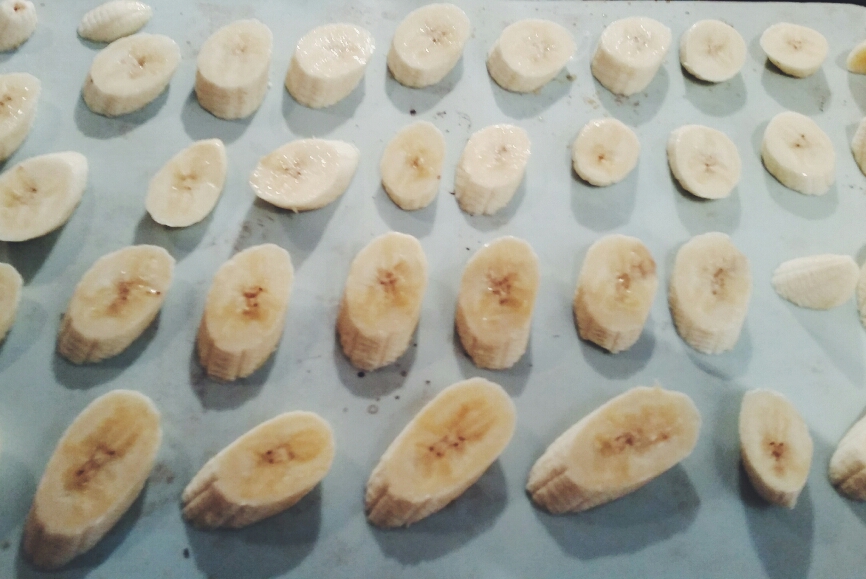 Si vous avez acheté de la banane séchée, passer à l’étape suivante sinon : Préchauffer le four à 70°C , peler et découper en rondelles de 5mm d’épaisseur les bananes et les déposer sur une plaque recouverte de papier sulfurisé sans laisser les morceaux se toucher. Enfourner 4h en retournantà mi cuisson.