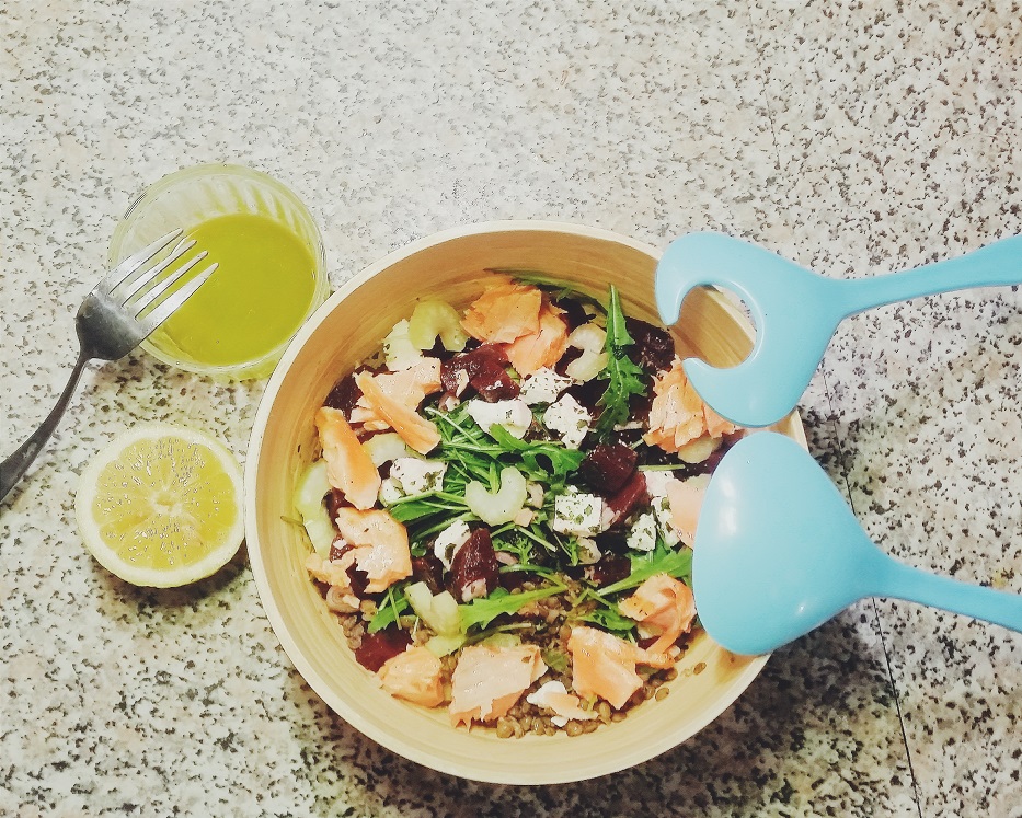 Mettre la roquette dans le fond d’un plat/lunchbox puis déposer les lentilles, le céleri, les betteraves, la fêta, les échalotes et les morceaux de saumon. Parsemer la coriandre dessus, saler et poivrer.