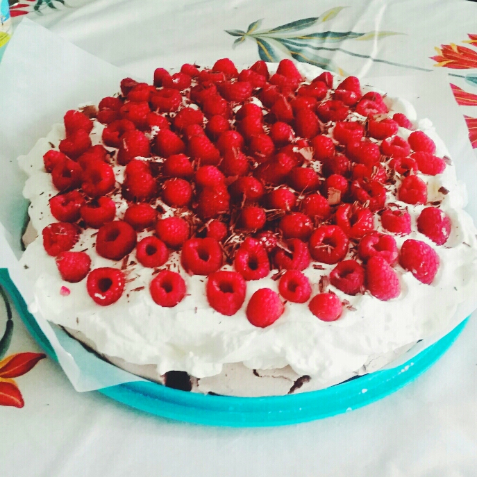 J’ai vu cette recette sur le site de Nigella Lawson (que je suis depuis une dizaine d’années à la télé puis sur le net) qui semblait très appétissante. Le Pavlova est un de mes desserts préféré parce qu’il est léger sans en avoir l’air, facile à réaliser (surtout lorsqu’on a un robot) et j’avais envie de tester une version différente. Je fais peu de gâteaux au chocolat (même si là j’en ai fait 2 en 2 jours…) donc c’était l’occasion. C’est quand même beaucoup plus « riche » que la version « nature » mais ça reste une belle alternative et un bon dessert pour un repas dominical (du dimanche)