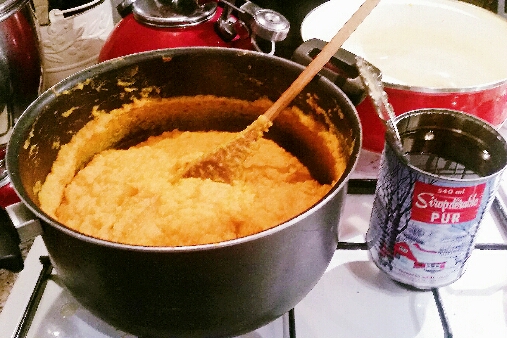 Éplucher les patates douces, les couper en 4 et les faire cuire dans un grand volume d’eau salée jusqu’à pouvoir enfoncer facilement un couteau dans chaque morceau. Les égoûter, les passer au presse-purée puis ajouter le beurre, remuer et remettre sur le feu pour assécher un peu la purée. Ajouter le sirop d’érable, mélanger et réserver. Faire la même opération pour les pommes de terre et ajouter seulement du beurre, il faut que cette purée reste un peu sèche.