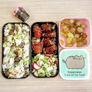 Salade de poulet, riz semi-complet, avocat, fromage persillé (fourme d’ambert), chou chinois, croutons de pain, vinaigrette huile d’olive/balsamique Salade de fenouil, radis et coriandre Aubergines grillées, tomates séchées Raisin